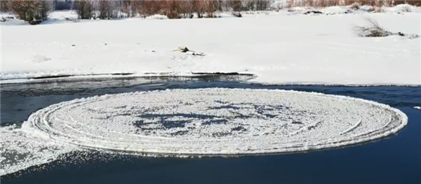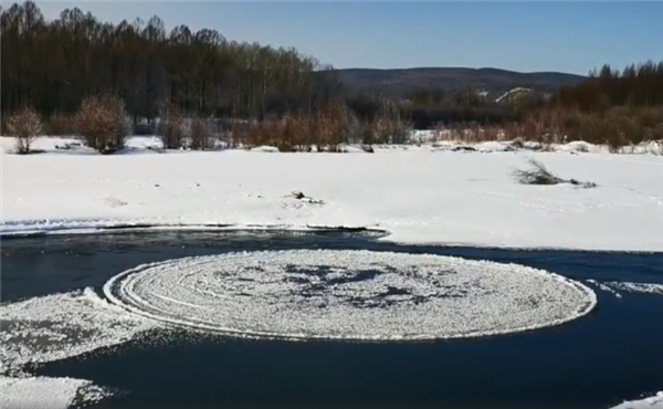 据国内媒体报道,11月18日,在内蒙古自治区根河市好里堡办事处西郊河畔出现旋转的冰圆盘,直径达6米左右,时隔一年,冰圆盘再现“中国冷极”。河水中出现直径约6米的神秘圆形冰盘,随着河水流动逆时针旋转,就像有人在寒冷的冰面上,用切冰机雕刻而成。