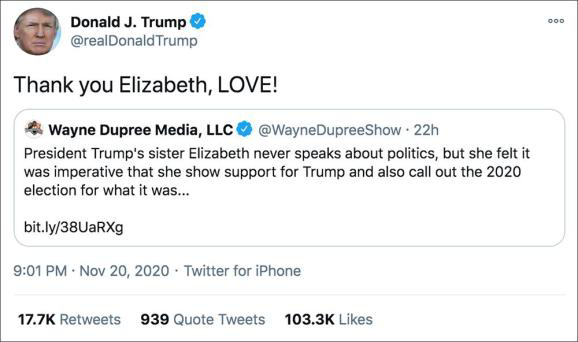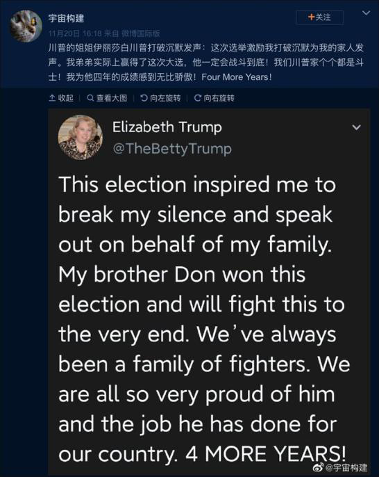11月20日,微博账号“@宇宙构建”发布博文称:“川普的姐姐伊丽莎白川普打破沉默发声:这次选举激励我打破沉默为我的家人发声。我弟弟实际上赢得了这次大选,他一定会战斗到底!我们川普家个个都是斗士!我为他四年的成绩感到无比骄傲!Four More Years! ”