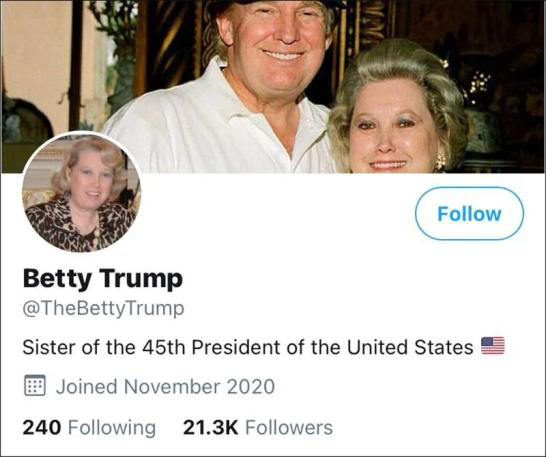 文章的来源引用了一个名为@TheBettyTrump的推特账号的推文,账号使用了特朗普姐姐Elizabeth Trump Grau的照片作为个人资料图片。