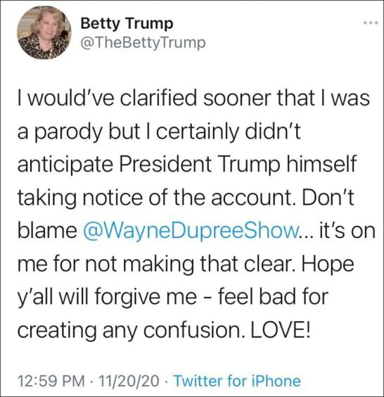 随后,Elizabeth Trump Grau账号的运营者现身推特: “我会早点澄清我是一个模仿者,但我当然没想到特朗普总统会亲自注意到这个账号。希望大家能原谅我,对于造成的混乱感到很难过。爱!”