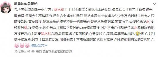 当然,了解软水机的朋友一定对美容护肤这个词不陌生。没错,许多商家在宣传时都会提到软水对皮肤的作用。前面我们提到过,软水可以抑制真菌。虽然美容效果不会立竿见影,但长期使用,确实要比直接用自来水洗脸是好的。许多家里购买了软水机的网友也用亲身经历验证它的效果~ 特别是洗头发的感受较为直观,许多用户都说洗后头发柔顺了不少。(本炸毛星人已经种草了)