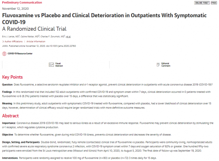 研究人员在《JAMA Network》上发表了一项针对新冠患者的双盲、安慰剂对照研究的初步结果。医生和被诊断为COVID-19的152名患者都不知道在两周的时间里谁在服用药物或安慰剂。医生远程观察患者的病情进展,建议他们在病情严重程度增加的情况下采取什么措施。