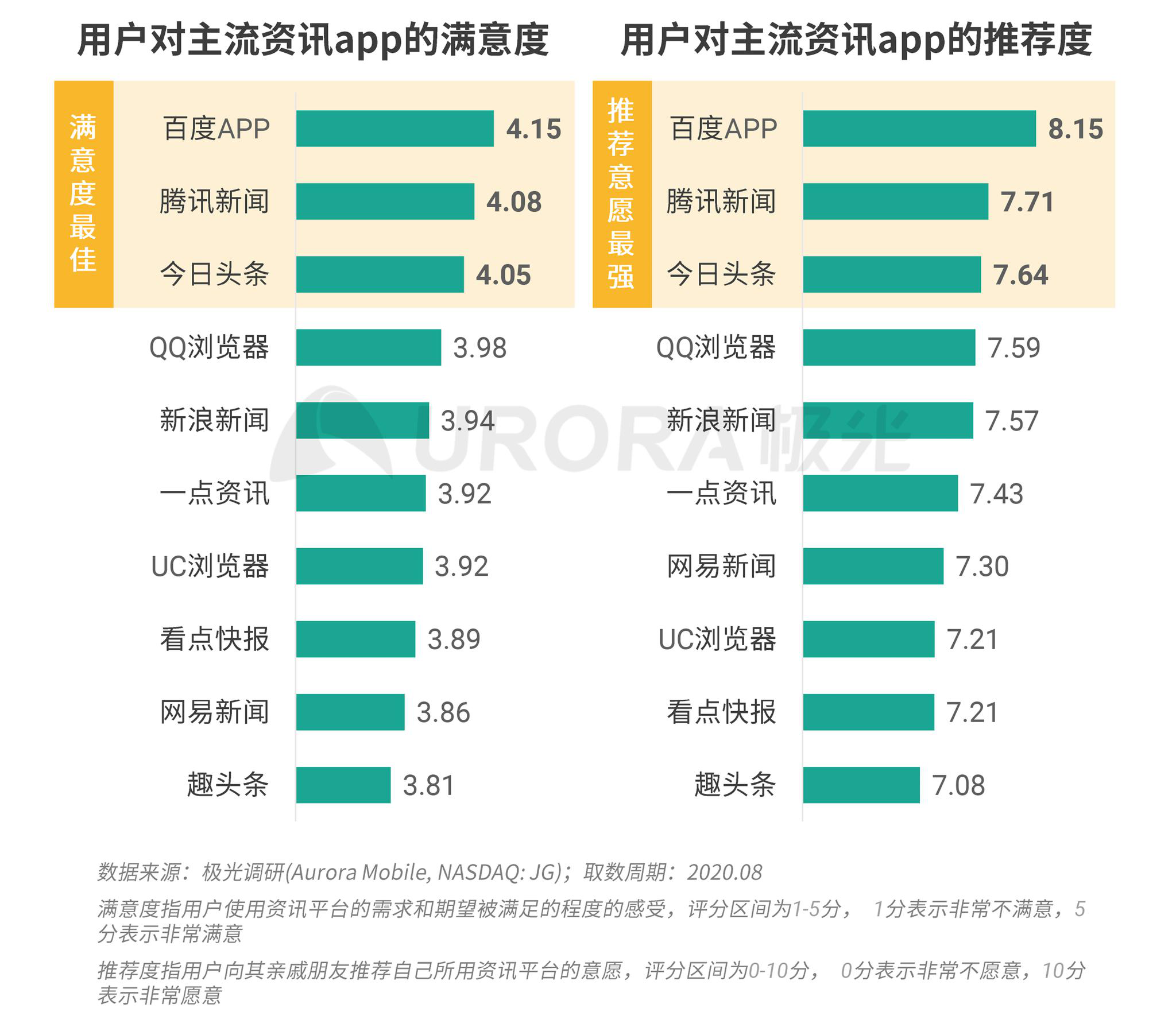 百度APP为满意度及推荐度最高的平台,其丰富的内容生态及优秀的内容分发能力优势显现