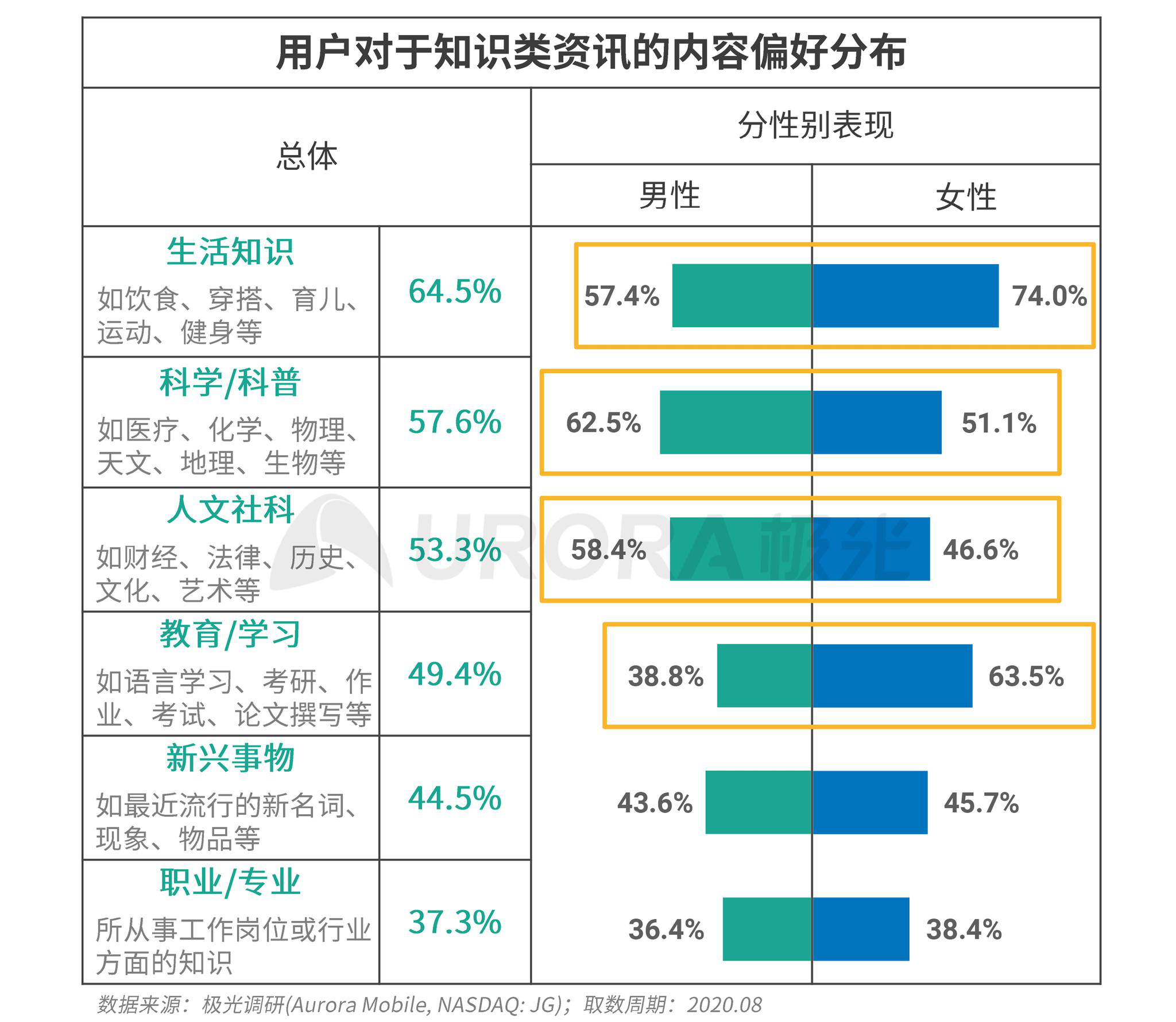 生活知识为最受众知识类资讯内容,不同性别群体对于不同方面的内容偏好差异显著