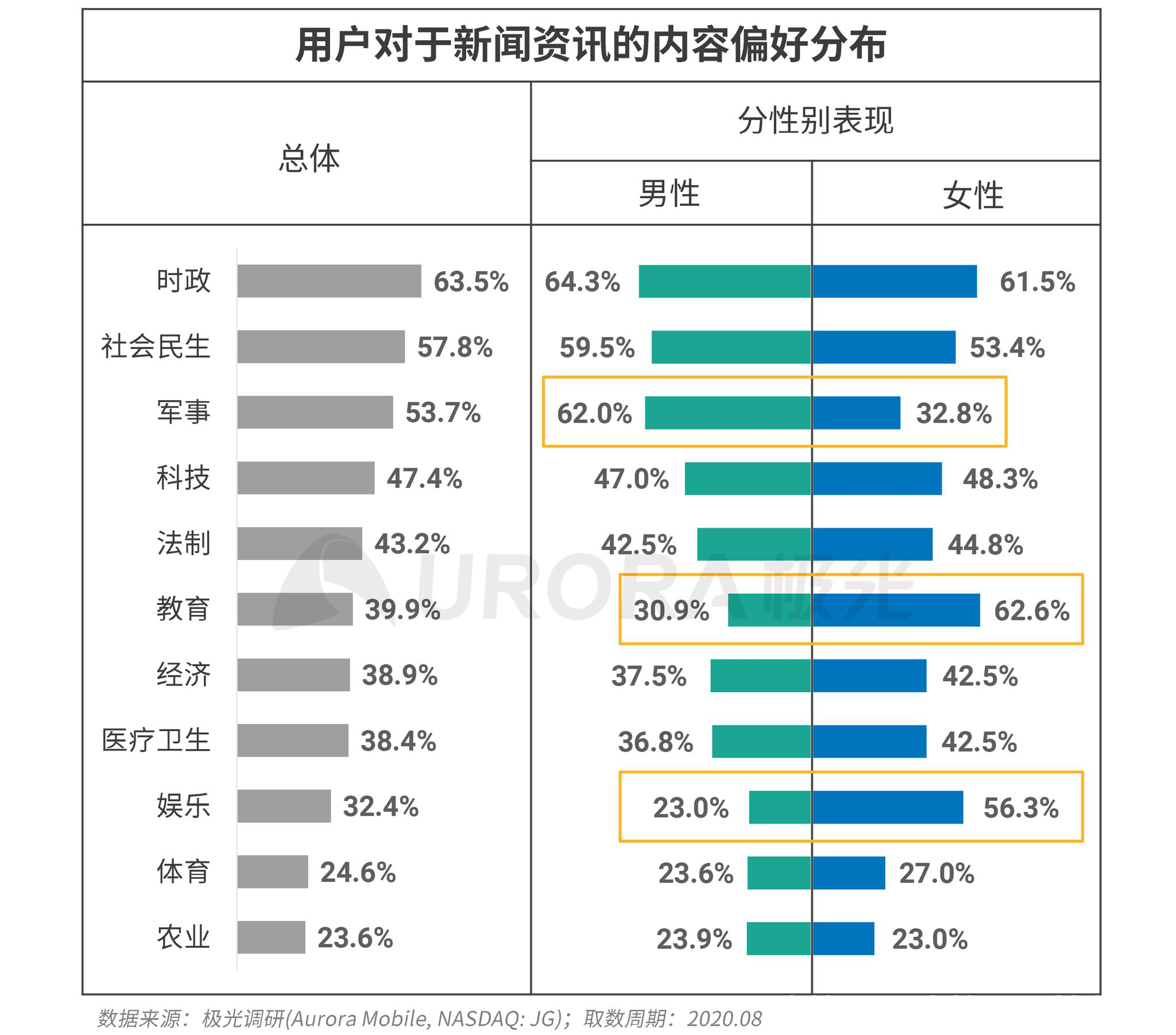 时政为公众最关注的新闻资讯内容,不同性别用户对于军事、教育及娱乐方面的资讯关注度差异明显