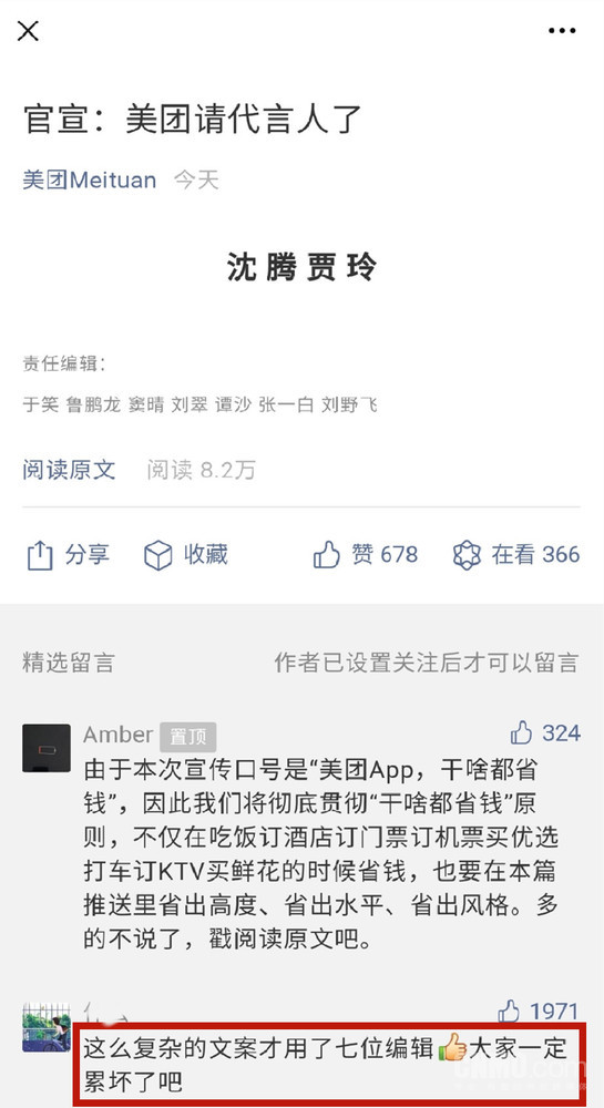 值得一提的是,遵循“字少事大”的宣传原则,今天中午,美团微信官方发送了一篇名为《官宣:美团请代言人了》的微信文章,文章里只写了“沈腾贾玲”四个字,但文章的责任编辑却有七位,这引起了网友调侃。网友评论称,“这么复杂的文案才用了七位编辑,大家一定累坏了吧。”讽刺之味溢于言表。