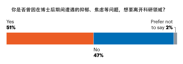 除了长时间的工作,工作前景和薪酬不稳定外,博士后还会面临工作期间遭遇歧视或骚扰、不平等以及霸凌等情况,这严重威胁着他们心理健康。由于这些因素造成的心理压力,51%的博士后受访者考虑过离开科研领域。其中,男性与女性受访者中,考虑过停止科研的分别有46%和55%。