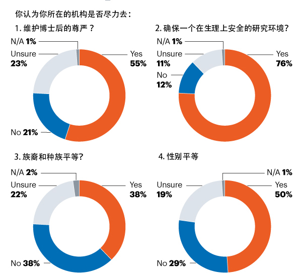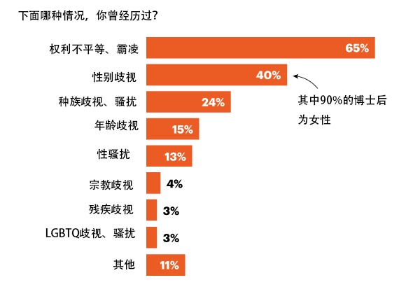 近65%的博士后表示自己遭受过权力上不平衡或受到霸凌,40%和24%的受访者表示受到过性别歧视和种族歧视。在国外工作的博士后比在本国工作的同行更有可能受到骚扰或歧视,两者比例分别是25%和21%。在这一调查中,女性受到歧视或骚扰的比例是30%,高于男性的18%。只有一半的受访者表示,他们的机构在支持性别平等方面的工作比较充足,而略多于1/3的人表示他们所在的机构完全解决了这些问题。