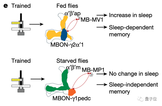 研究发现,在吃饱时,果蝇的记忆由蘑菇体前后α’/β’神经元介导,而饥饿时的记忆则由蘑菇体中间的α’/β’神经元介导。