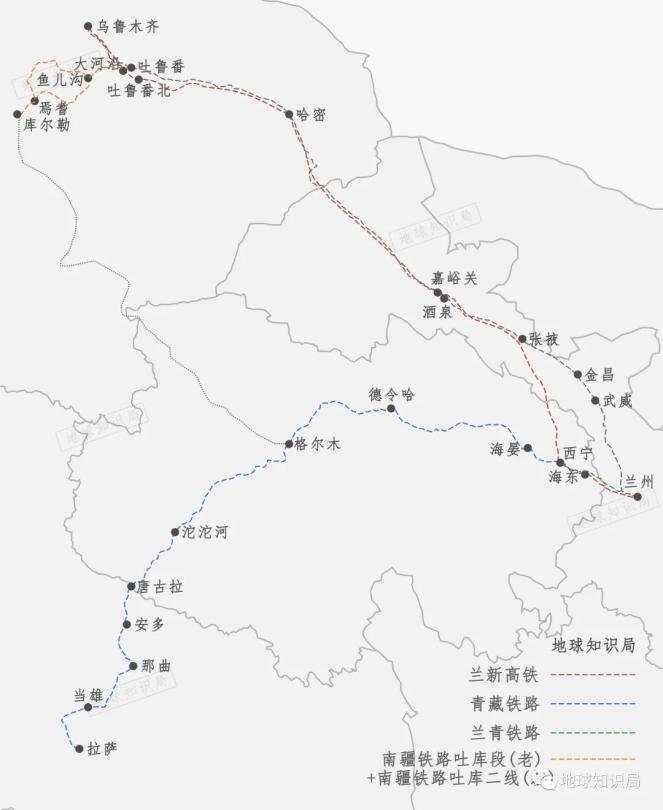 通向乌鲁木齐和拉萨的铁路由此,两市可通过兰州站中转或换向实现铁路直连。不过,这只是实现了理论形式上的铁路直连,实际作用有限,毕竟要多绕行约1300公里。客货运输方面,远不如依靠空运或利用南疆铁路和库尔勒至格尔木的公路实现公铁联运。