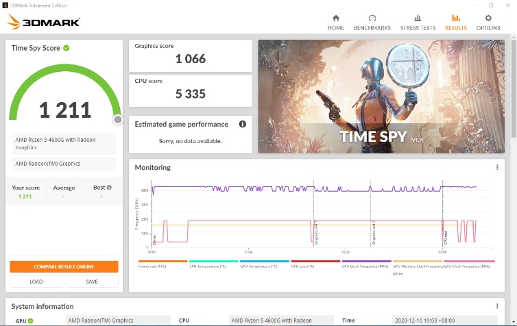 R5 4600G 的核显在Time Spy 上得分1066分,大约是 MX 150-250的水平。