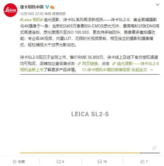 视频方面,在开启L-LOG伽马曲线功能的时候,SL2-S可以拍摄4K、C4K 10bit 4:2:2的高分辨率视频,帧率达60fps,后续通过固件更新还将支持支持10bit、高达 4K/60p 录制的高效 HEVC 视频压缩标准。徕卡SL2-S现已于全球上市,售价人民币35800元。