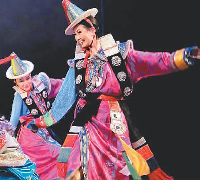 图为身着民族服饰的蒙古国青年在那达慕大会上表演节目。