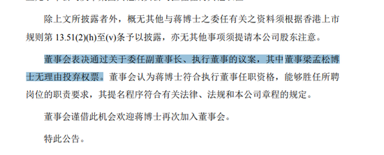 在中芯国际的公告中,对于蒋尚义的任职,中芯国际联席CEO梁孟松无理由投弃权票。
