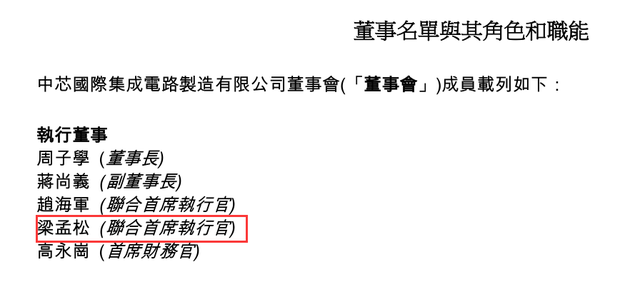 在中芯国际15日晚披露的《董事名单与其角色和职能》公告中,梁孟松的职位没有发生改变,他依然是联合首席执行官兼执行董事。