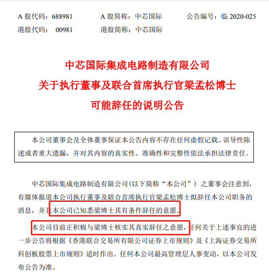 公司目前正积极与梁孟松核实其真实辞任之意愿,同时表示,公司任何最高管理层人事变动,以公告为准。