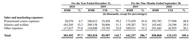 公司招股书显示,2018年、2019年,一起教育的营销费用分别为人民币3.03亿元、5.84亿元,占营收的97.7%及144%;2020年前三季度则为8.51亿元,同比增长92.39%,超过同期营收8.08亿元,占营收的105%。