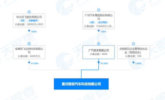 天眼查股权穿透图显示,安徽讯飞云创科技有限公司、广汽资本有限公司各自持有该公司47.06%股份,二者分别为科大讯飞股份有限公司、广州汽车集团股份有限公司的全资子公司。