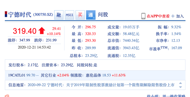 新浪科技讯 12月21日下午消息,宁德时代涨超10%每股股价报319.40元,市值破7000亿达7440亿元。