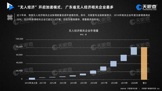 近十年来,我国无人经济相关企业新增数量呈逐年递增态势,其中,天眼查专业版数据显示,2016年相关企业年度注册增速高达50%,2020年新增相关企业已超过1.9万家,分别为增速最快、增量最多的年份。