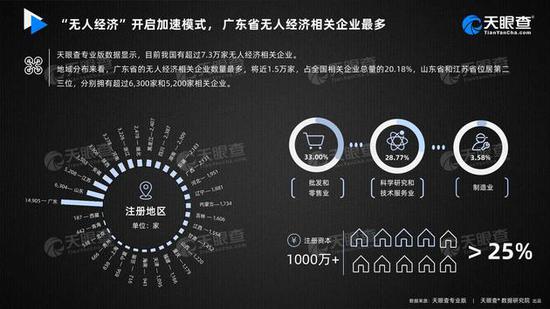 行业方面,数据显示,无人经济相关企业集中分布在批发和零售业(33.00%)、科学研究和技术服务业(28.77%),另有约3.58%的相关企业为制造业。另外,超过25%的无人经济相关企业的注册资本超过1000万元人民币。