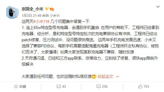 此前有部分小米 11 用户发现,小米 11 使用小米 65W GaN 充电会出现无限自动重启的问题。复现方式是当小米 11 在电量 20% 以下的时候,在亮屏状态下连接小米 65W GaN 充电器,然后关屏即触发。目前该问题至少在 MIUI 12.0.12 稳定版中仍存在。