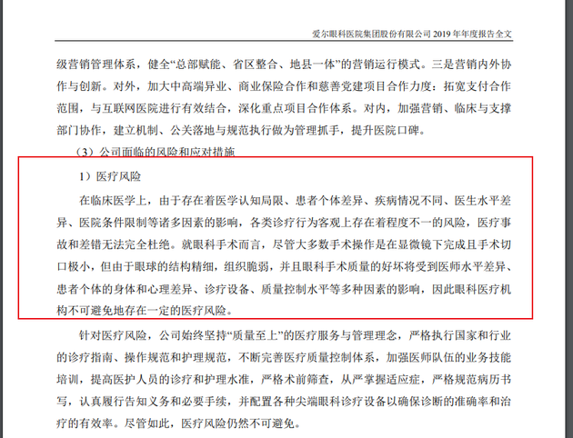 事实上,在爱尔眼科多次的定期报告中,也常会提到防范医疗风险。在2019年度报告中就表述,“但由于眼球的结构精细,组织脆弱,并且眼科手术质量的好坏将受到医师水平差异、 患者个体的身体和心理差异、诊疗设备、质量控制水平等多种因素的影响,因此眼科医疗机 构不可避免地存在一定的医疗风险”。