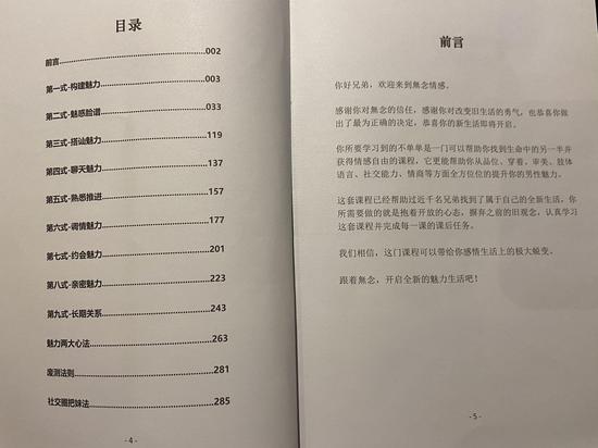 “夏天导师”拿给记者一份公司内部培训新导师的《魅力九式》教材,称是公司创始人根据多年教学实践总结而成,独创了“七天把妹流程”、“废物测试”的分类和破解法则、社交圈“把妹”的方法。