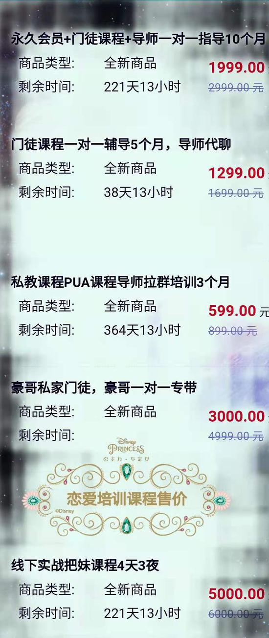 在网上提供恋爱指导服务的“楚王情感”提供599元的“线上会员班”教学及一对一私教服务,后者一年5980元。“线上会员班”十节课,含如何“改造”外形,“建设”朋友圈、如何引导女生对男生不断投资、如何使用推拉的话术技巧、和女生调情暧昧聊性话题的技巧,发生亲密关系及如何不伤害女生的“甩尾”等内容。