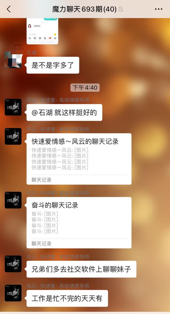 同样,在微信小程序“快速爱聊天助手”,支付400元报名“魔力撩妹”课程后,自称为“高级情感导师”的“风云导师”将记者拉入到“魔力聊天693期”微信群。晚上8点半,导师会通过语音授课教学员如何通过社交软件获取女性资源,“搭讪、与女生开场聊天、约会、调情暧昧”等。