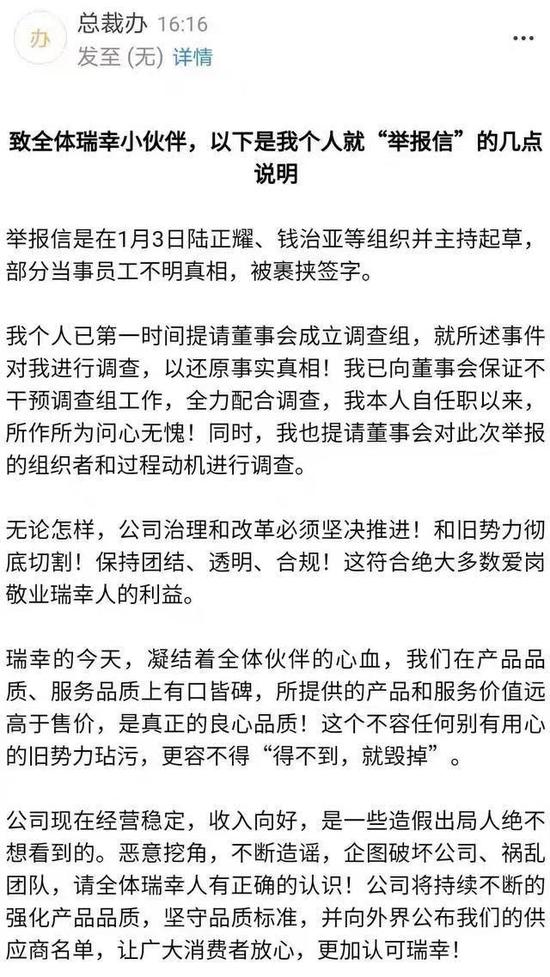 而一位接近瑞幸内部的人士告诉21世纪经济报道记者,举报信和全员信的内容属实,对于事情的结果也会在调查之后逐渐清晰。