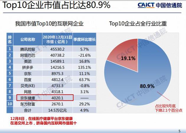 排名市值前十位的公司分别是:腾讯控股、阿里巴巴、美团、拼多多、京东、百度、贝壳、网易、京东健康、东方财富。这10家企业四季度末占全行业比重80.9%,比三季度末下降2.1个百分点。