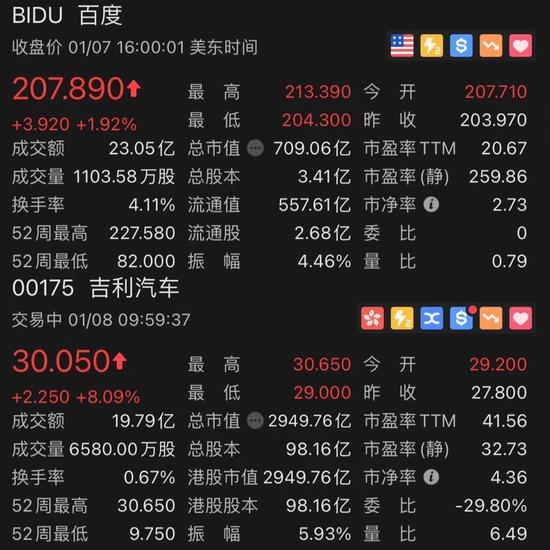 针对上述消息,百度和吉利均对第一财经表示不予置评。受回港二次上市传闻与造车传闻等消息影响,当日百度股价上涨1.92%,以207.89美元收盘,今日吉利汽车(00175,HK)股价开盘即上涨10%,达到30.25港元。