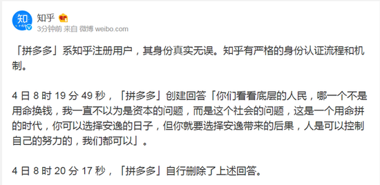 当日晚间,知乎官方账号称“拼多多”系知乎注册用户,其身份真实无误。知乎有严格的身份认证流程和机制。“拼多多”的回应为自行删除。