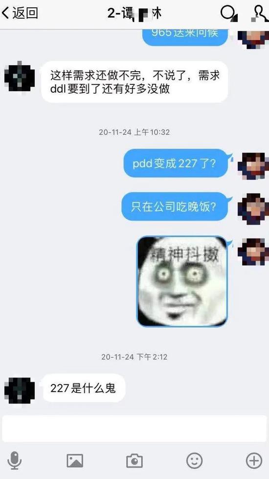 去年11月24日,早上10点半,李丁问:“pdd变成227了?只在公司吃晚饭”他听到传言,拼多多加班时间改成下午两点到凌晨两点。