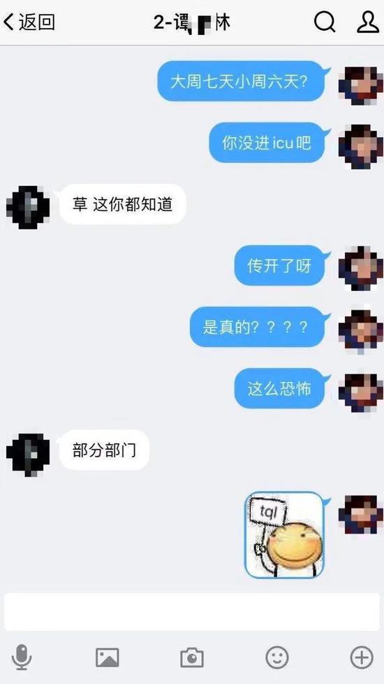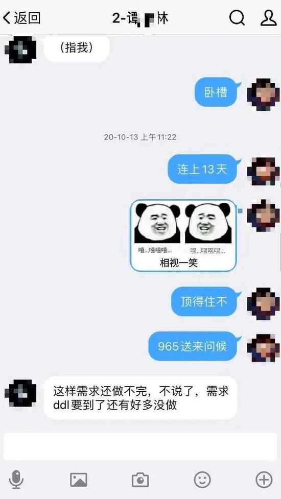 去年10月,李丁问:“你那边是不是要连上13天?顶不顶得住?”小谭回复:“这样需求还做不完,不说了,需求ddl要到了还有好多没做。”