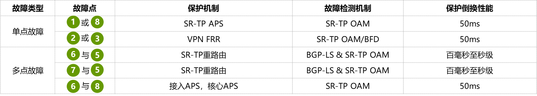 如图4所示,不同故障点触发的保护机制、检测机制、保护倒换性能不同,总结如表1所示。