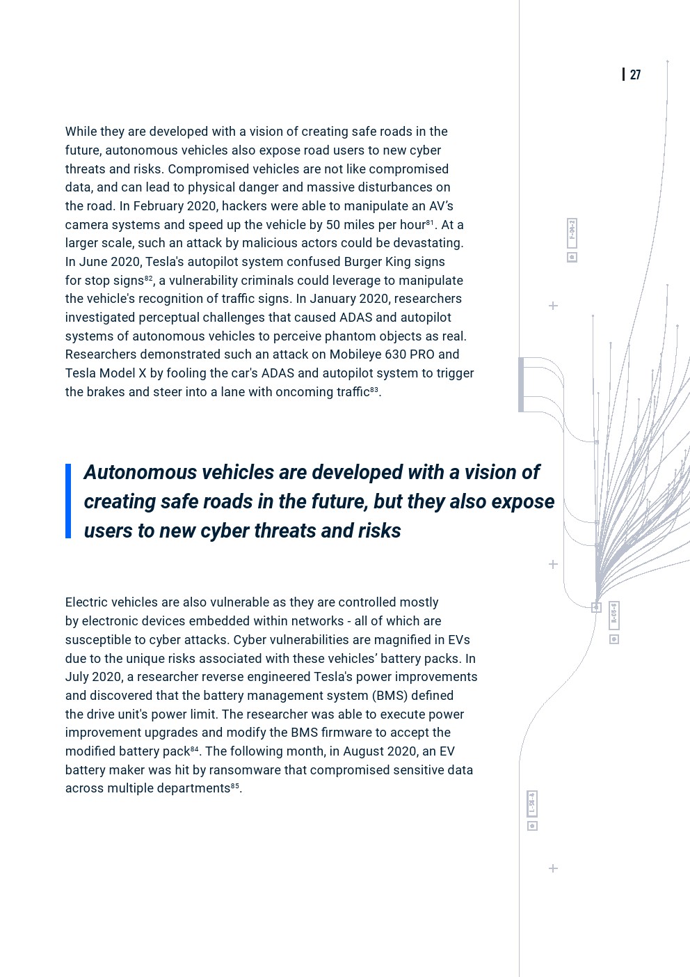 Upstream发布了“2021年全球汽车网络安全报告”,到2023年,联网汽车预计将占全球所有乘用车的1/4。到2025年,联网汽车将占全球汽车市场的近86%。它们将比通用汽车在1996年推出的只有应急呼叫系统的第一个“联网汽车”模型复杂得多。联网汽车已经添加了更多的计算机化系统,并且车辆将继续发展个性化高级技术功能。虽然连接的组件和系统对于增强车辆的功能,推进自动驾驶汽车(AV)并提供更好的用户体验至关重要,但它们还引入了其他漏洞和黑客可以利用的切入点。