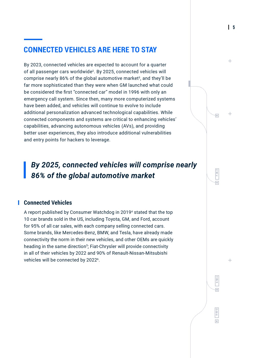 消费者观察家组织(Consumer Watchdog)在2019年发布的一份报告指出,在美国销售的十大汽车品牌占所有汽车销量的95%,每个公司都销售联网汽车,包括丰田、通用和福特。一些品牌,例如梅赛德斯·奔驰、宝马和特斯拉,已经将联通性作为新车的标准,而其他OEM则迅速朝着同一方向发展。到2022年,菲亚特-克莱斯勒将为其所有车辆提供联通性。到20226年,90%的雷诺-日产-三菱汽车实现联网。