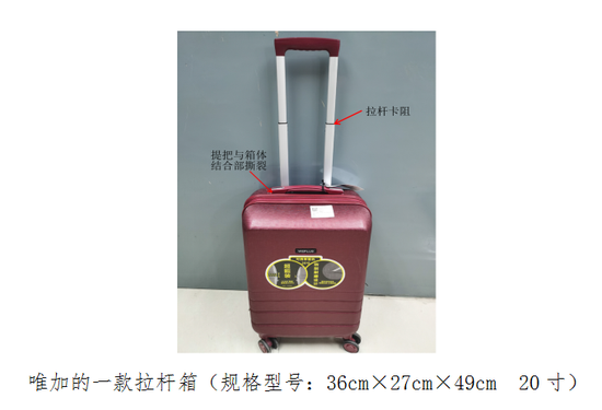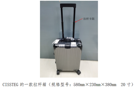 此次试验发现涉及唯加、CISSTEG2个品牌产品的拉杆耐疲劳性能不符合要求,主要体现在使用中会发生拉杆拉合不顺畅、卡阻等现象。