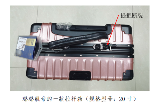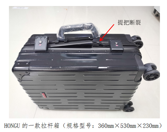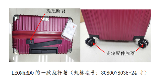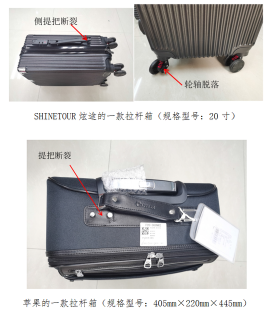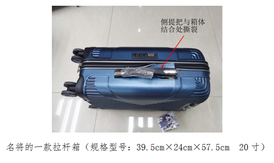 该项目是使用性能考核指标,检验提把、拉杆、包体等部位质量情况。经检验,有8个品牌的拉杆箱样品“不结实”“不耐用”,主要体现在测试后拉杆与箱体结合部开裂、提把损坏、拉杆损坏等。涉及HONGU、袋鼠、唯加、名将、LEONARDO、SHINETOUR炫途、苹果、璐璐凯帝等品牌。