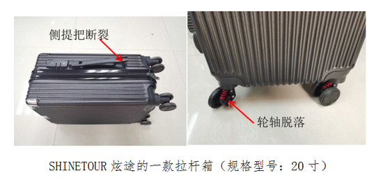 根据QB/T 2155-2018《旅行箱包》4.4.2条款规定,试验后走轮转动灵活、无卡阻、无变形;轮架、轮轴无变形、开裂,走轮磨损不大于2mm。经检验,标称SHINETOUR炫途1个品牌箱包产品的行走性能不符合要求,主要体现在按照标准要求测试后走轮轮轴脱落。