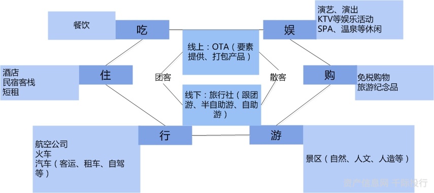 景区(包括自然、人文、人造景区)是旅游产业链的核心,相对掌握主动权(但运营商多数以国企为主,激励相对不足),而餐饮、住宿、交通、购物、娱乐等要素往往需要依托于景区资源,并且围绕其展开各项业务。游客既可以通过线上OTA方式进行要素预订和打包产品预订,也可以通过线下旅行社采购需要的旅游产品。