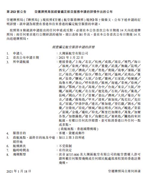 空运牌照局表示,按照《空运(航空服务牌照)规例》,任何申述或反对,以及任何要求进行公开研讯的通知,须在公告首次公布日期后 14 天内送达牌照局。
