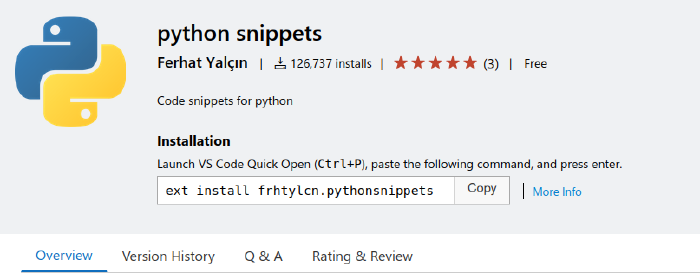 Python Snippets 下载地址:https://marketplace.visualstudio.com/items?itemName=frhtylcn.pythonsnippets