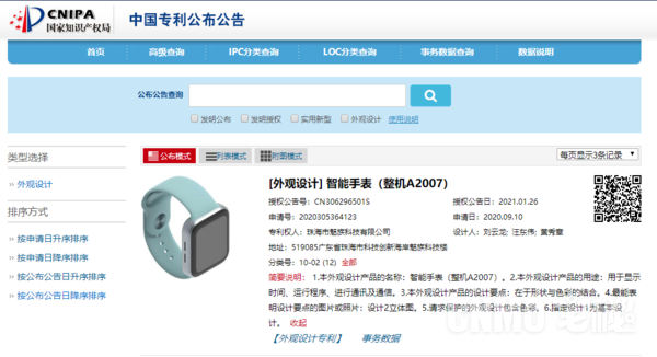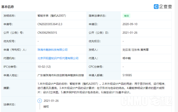 此前有消息称,魅族今年将会实行“一体两翼”战略,手机仍然是魅族的核心业务,同时会新增智能穿戴与智能家居业务。企查查APP显示,1月26日,珠海市魅族科技有限公司公开了一项“智能手表”外观专利,公开号CN306296501S,申请日期为2020年9月。