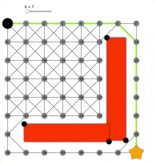k值越大,算法越容易到达目标,但同时准确性降低,导致生成的路径并非总是最短的。