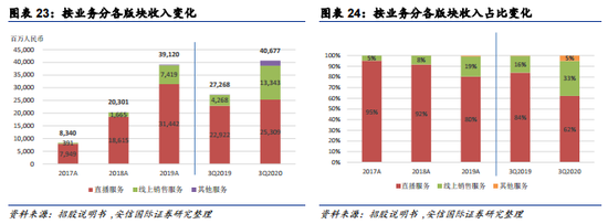 直播是快手最大的收入来源。直播电商GMV2019年达596亿,市场占有率14.3%。2017年、2018年、2019年及2020年9月30日止九个月,公司的直播收入占总收入的百分比分别为95.3%、91.7%、80.4%、62.2%,同比增速分别为134.2%、68.9%和10.4%。快手电商买家的平均复购率达到60%,2020年前三季度直播中平均每月付费用户数5990万人,而2019年同期是4850万人。