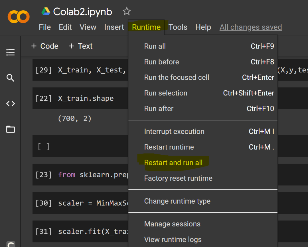 如果 Google Colab 内核有问题,你可以重新启动并运行所有代码,也可以像在 Jupyter notebooks 中那样从菜单中选择选项。具体来讲,选择「Runtime」,然后选择所需的选项。