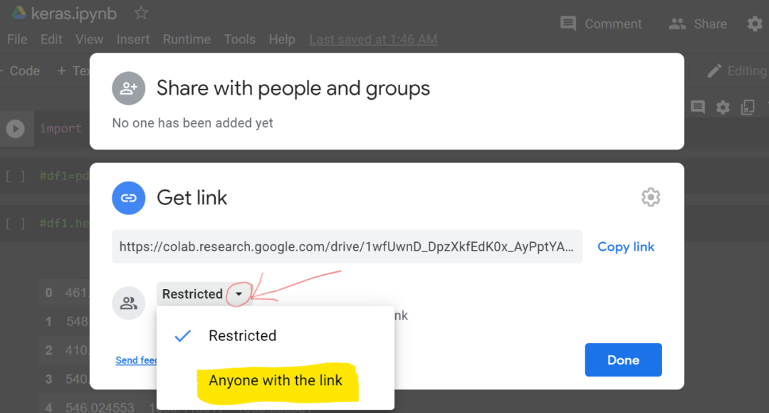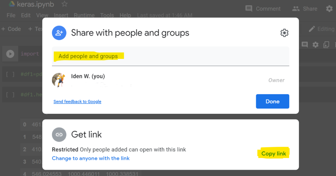 通过上述方式可以复制并分享 notebook。但是,如果你想分享文件,并希望同事可以看到文件更新和变更,则可以通过 notebook 左上角的链接(Copy to Drive)将其保存到 Drive 中,并共享来自 Google Drive 的链接。